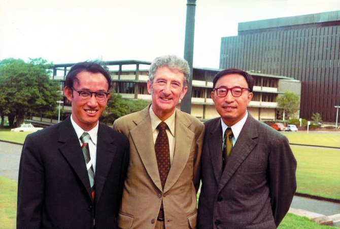 1981年摄于悉尼大学:右起:胡壮麟、韩礼德、龙日金