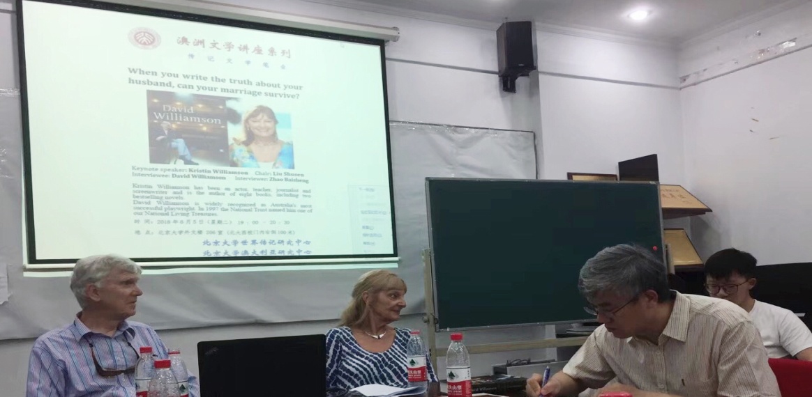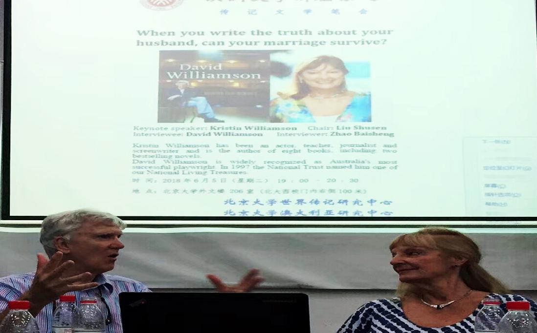 2018年6月5日,“澳洲文学讲座系列”与“传记文学笔会”联袂举办学术报告会,邀请澳大利亚作家克里斯汀·威廉姆森和澳大利亚戏剧巨擘大卫·威廉姆森夫妇围绕克里斯汀所著《威廉姆森传:幕后的故事》(David Williamson: Behind the Scenes)展开对话和讨论。活动分为三个部分:主题发言、高端对话和听众问答。这次活动由北京大学世界传记研究中心与北京大学澳大利亚研究中心合作举办。来自北京大学、清华大学和北京外国语大学的师生五十余人参加了本次活动。